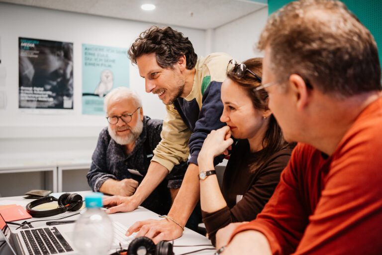 Unsere Kolleg:innen der CoP 3 behandeln in sechs Modulen Filmgewerke von Dramaturgie und Drehbuch über Kamera- und Tongestaltung bis hin zu Postproduktion und Sounddesign. Im Februar 2024 startete das Modul „Drehbuch und Dramaturgie“, im September folgte das Modul „Filmton“.